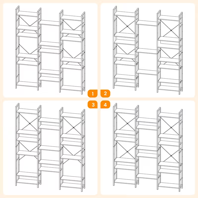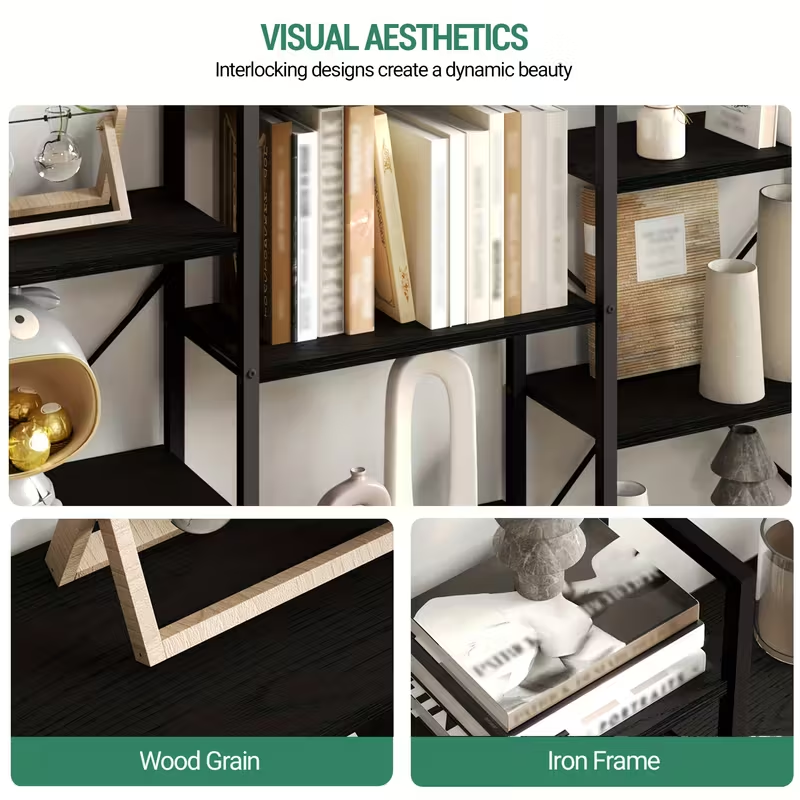 Shelf sections can be placed together or spaced apart depending on the width of the wall. They support both symmetrical and asymmetrical arrangements. This flexibility allows the creation of a home library, a separated work zone, or a decorative feature wall.